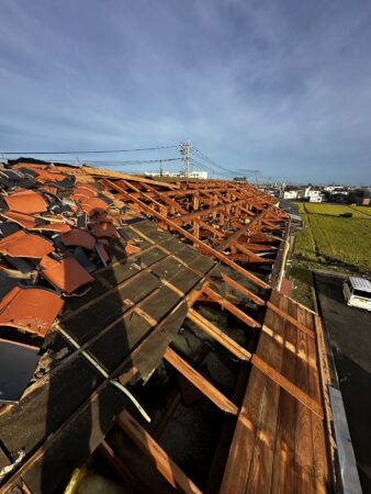突風によって屋根の半分以上が吹き飛ばされ、建物の骨組みにまで被害が及んでいました。