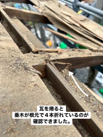 この時点で、下地を支える垂木が4本折れていることを確認しました。