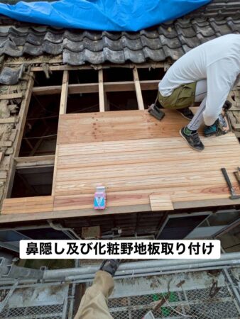 新しい化粧野地板を貼り、防水シートであるルーフィングをしっかりと施工。