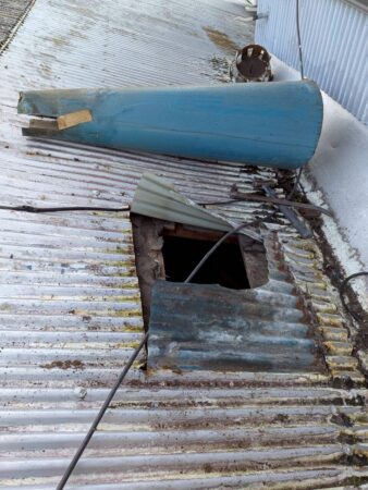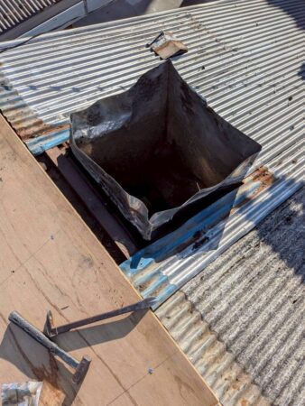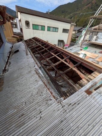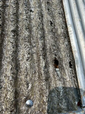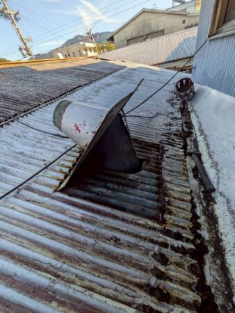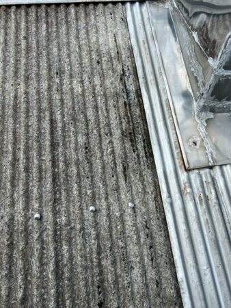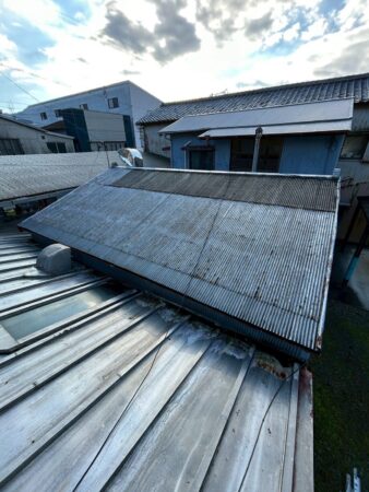 既存の鉄板小波屋根や、灯り取りとして使用されていたポリカーボネート部分は、経年劣化がかなり進んでいる状態でした。