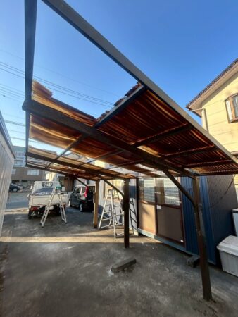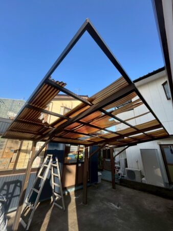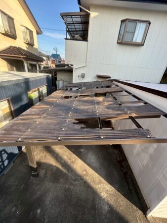 残っているポリカも経年劣化によりかなり傷んでおり、強風時には飛散の恐れがある状況でした。