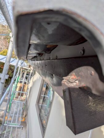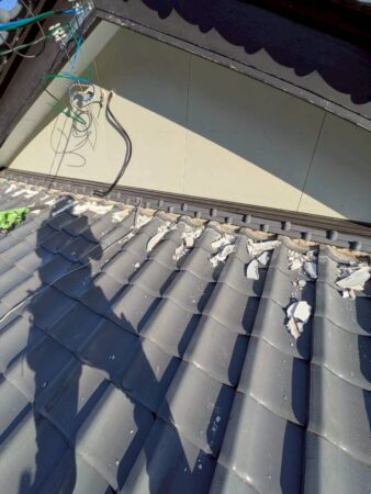 既存漆喰撤去後は、棟の内部にある**棟土(むねつち)**の状態を確認します。