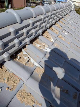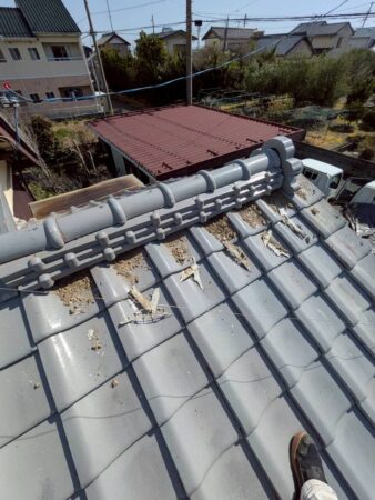 昔の工法では、棟瓦は土の上に乗せている構造となっており、現在主流のガイドライン工法(ビス固定)とは異なります。